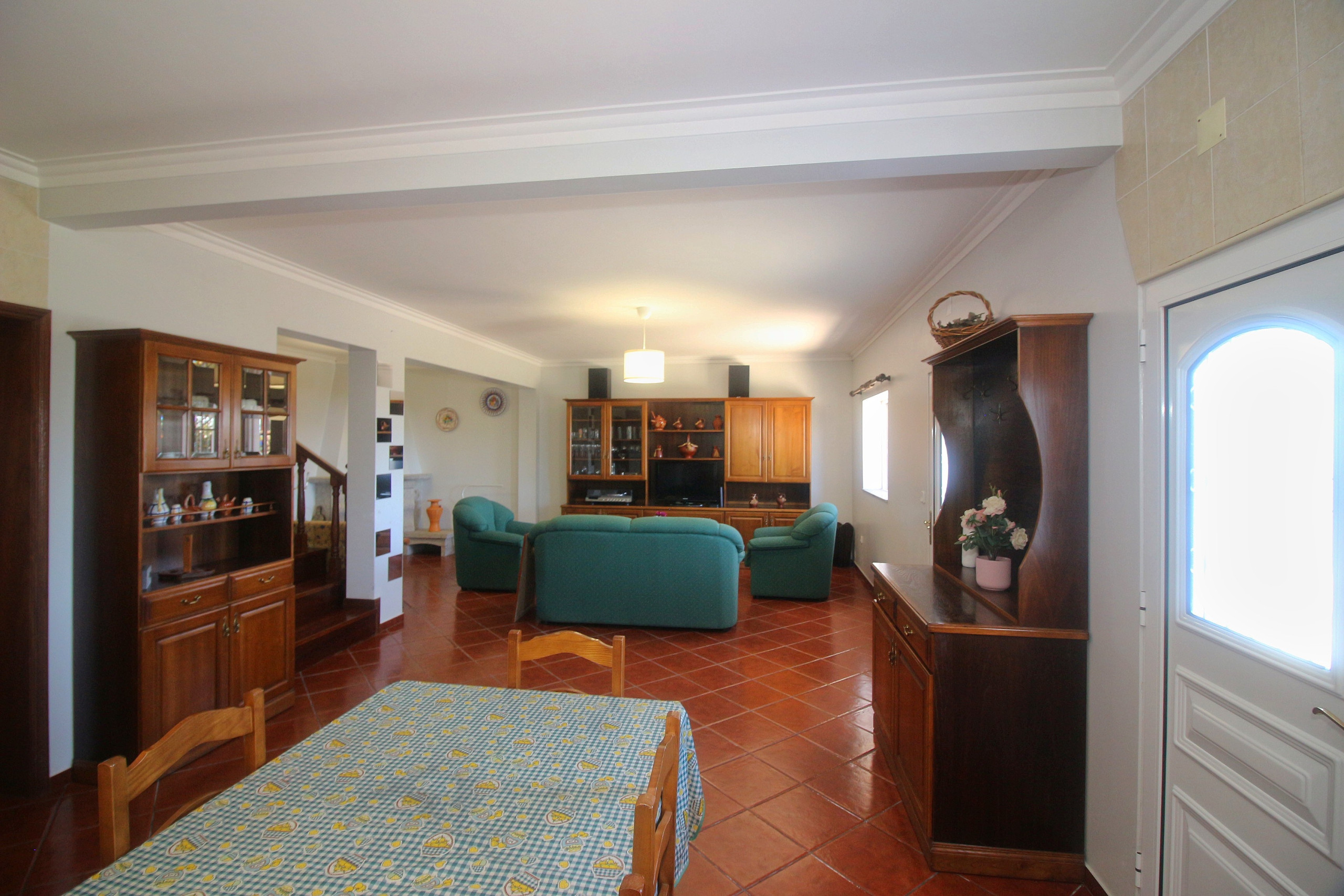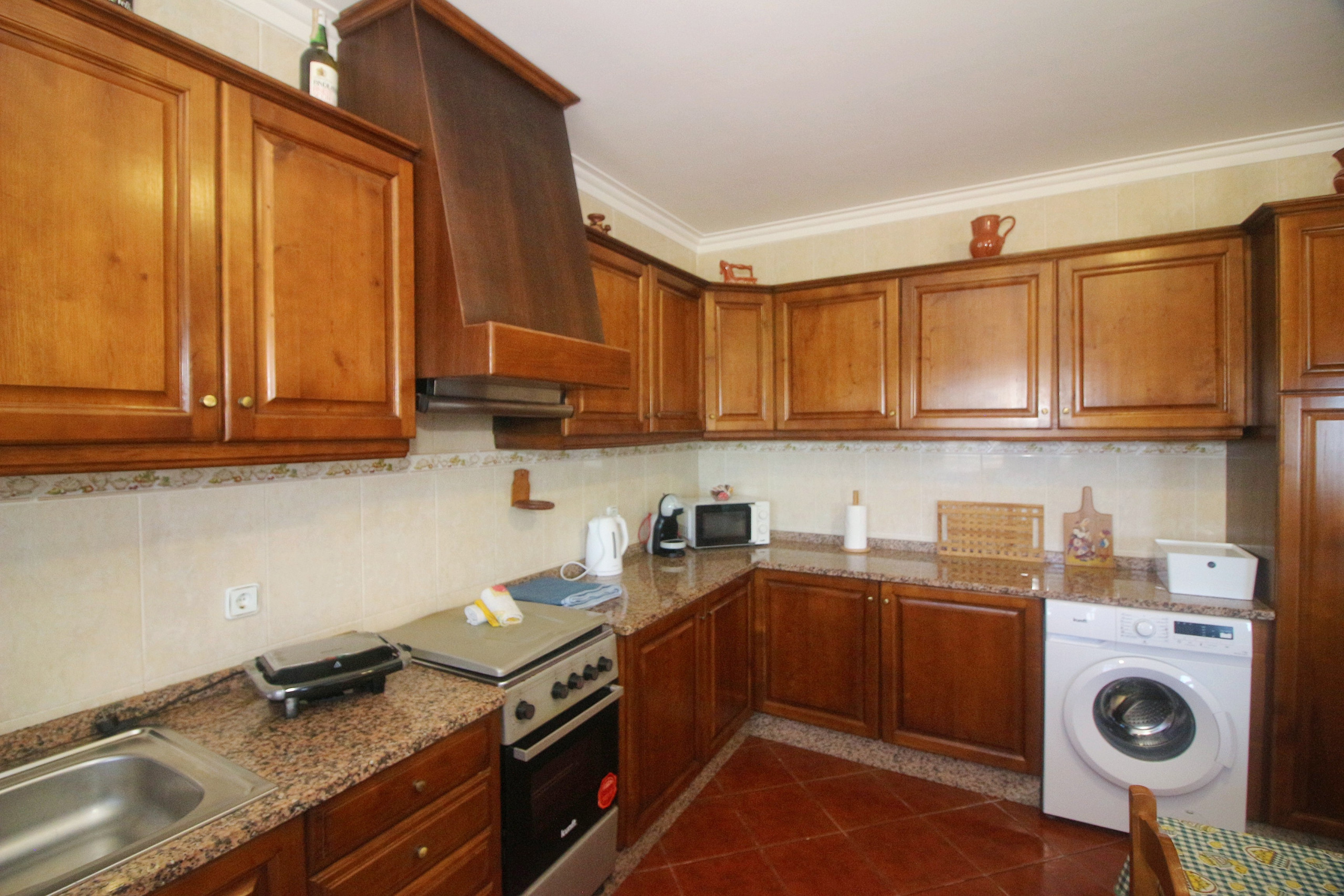 A cozinha americana totalmente equipada é um verdadeiro ponto alto da casa. Conta com todos os eletrodomésticos essenciais, incluindo frigorífico, máquina de lavar, forno, micro-ondas, máquina de café, torradeira e chaleira. Preparar refeições em família ou com amigos será um prazer neste espaço funcional e bem pensado.